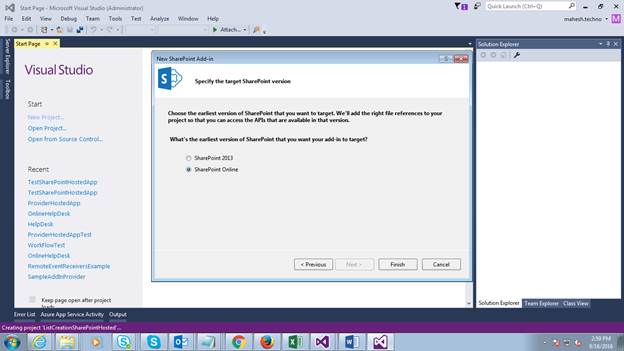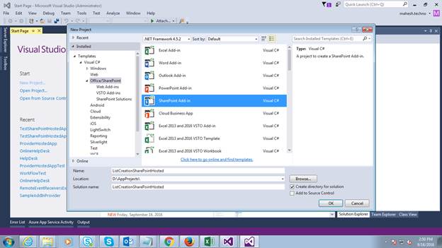 Select the SharePoint Add-in Template, give a name to the project, and select the project location. Click on OK.