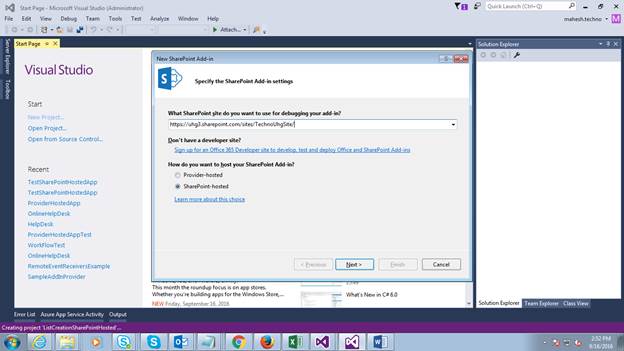 - Give the URL of the Office 365 Site where you are going to debug or deploy the App and select SharePoint Hosted App.