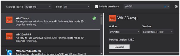 Next go to code behind page and write the following code to get the list of fonts available in the system and assign it to the list. Before that we need to add the NuGet package “Win2D.uwp” like the following image.