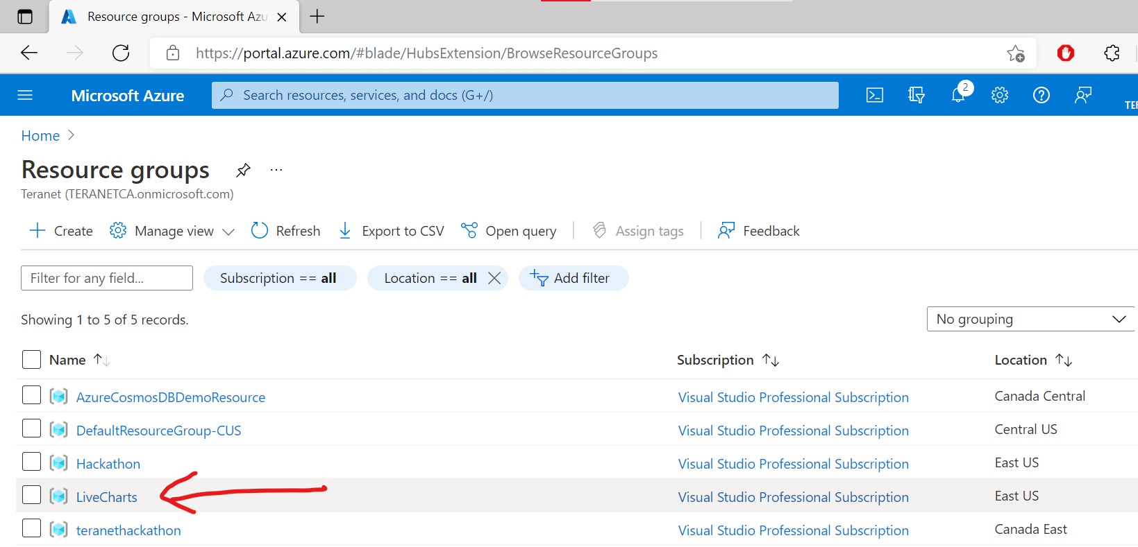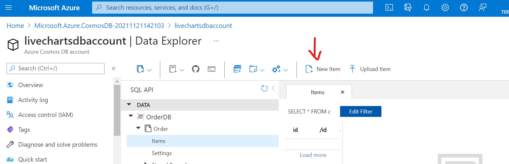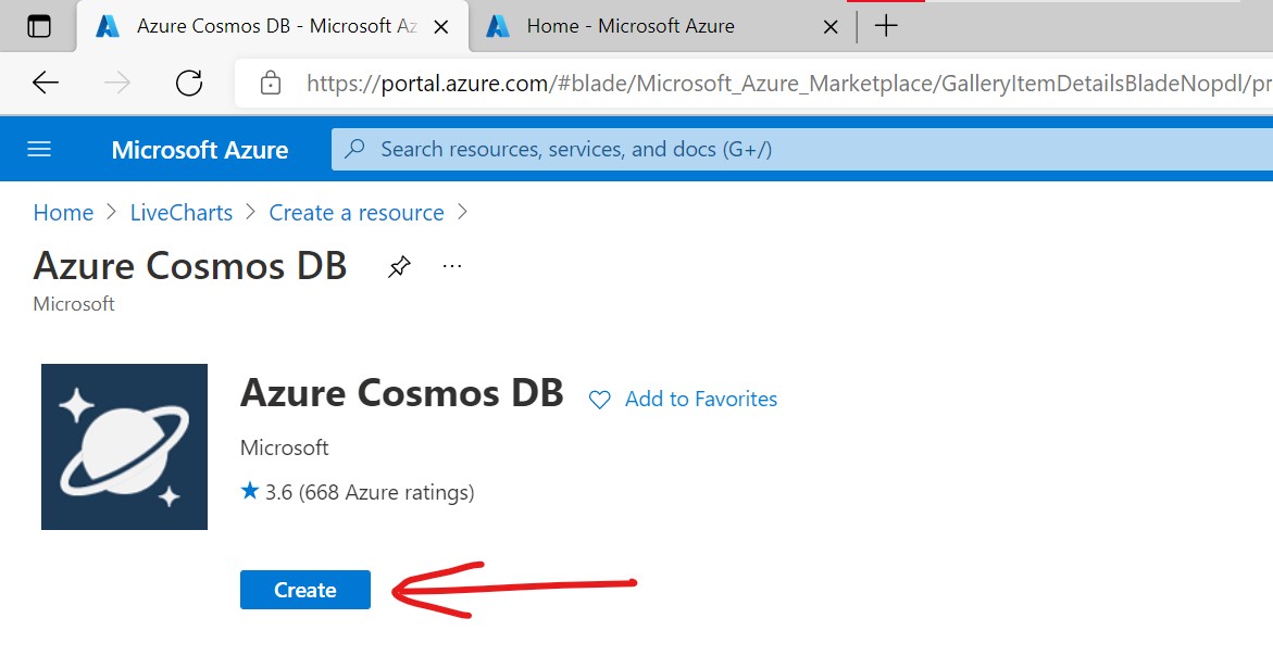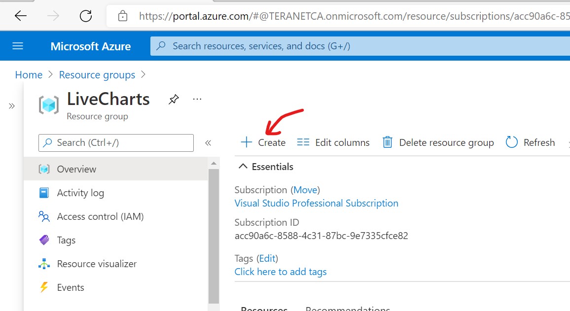 Click on the resource group (LiveCharts in our case) to open the resource group window and click on Create button