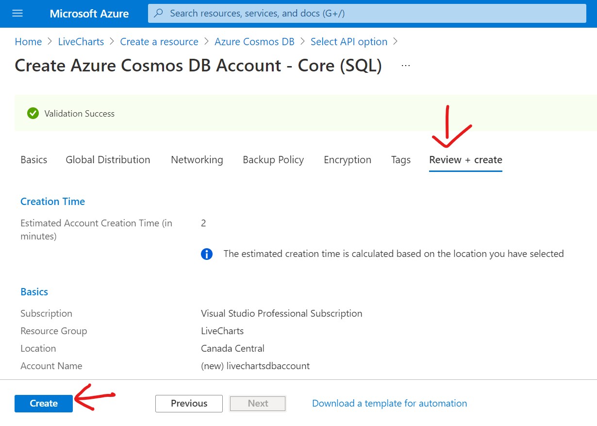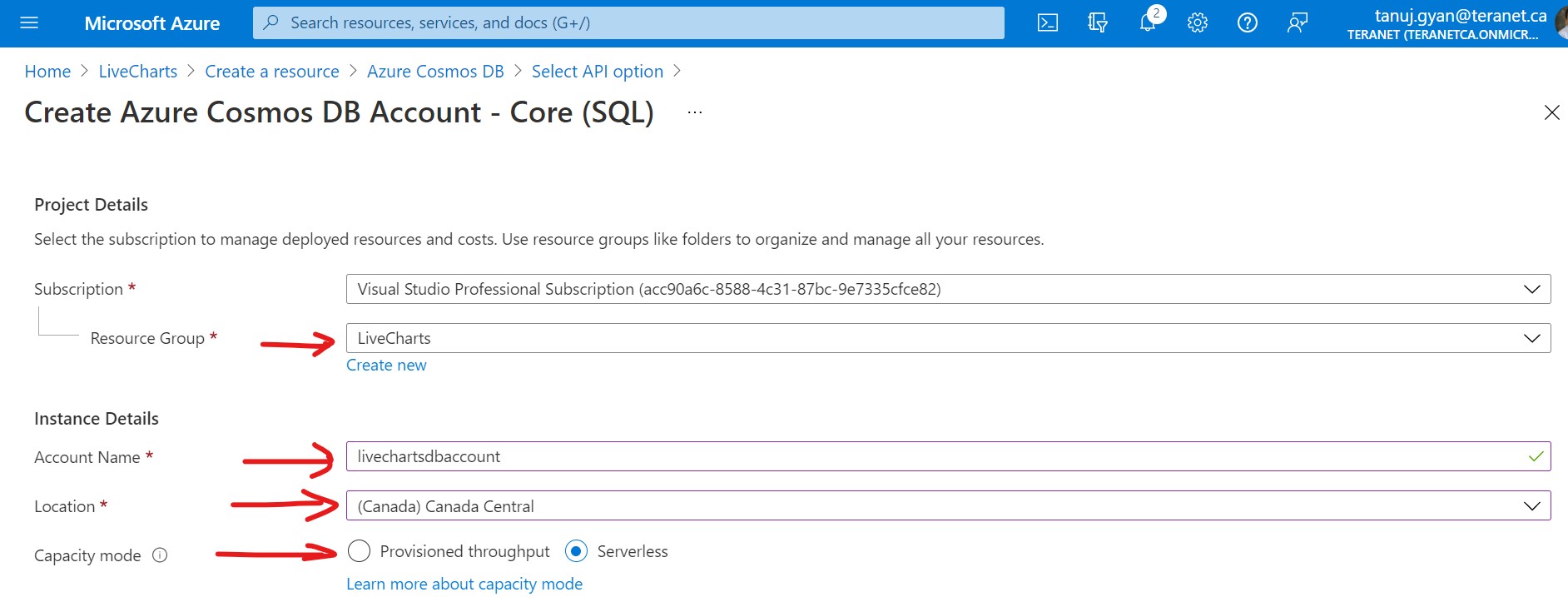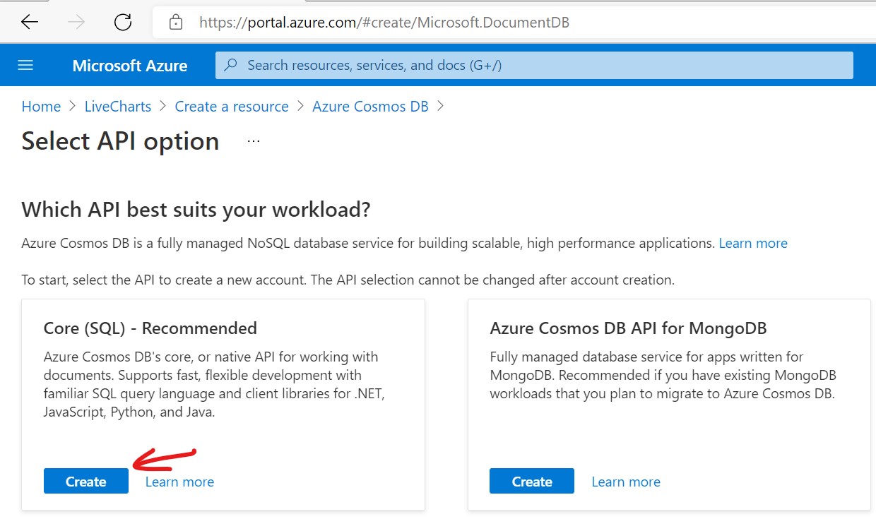 Make sure the resource group is LiveCharts (or your own resource group), Enter Account Name (you can give any name you want), choose a location and change the capacity mode to serverless
