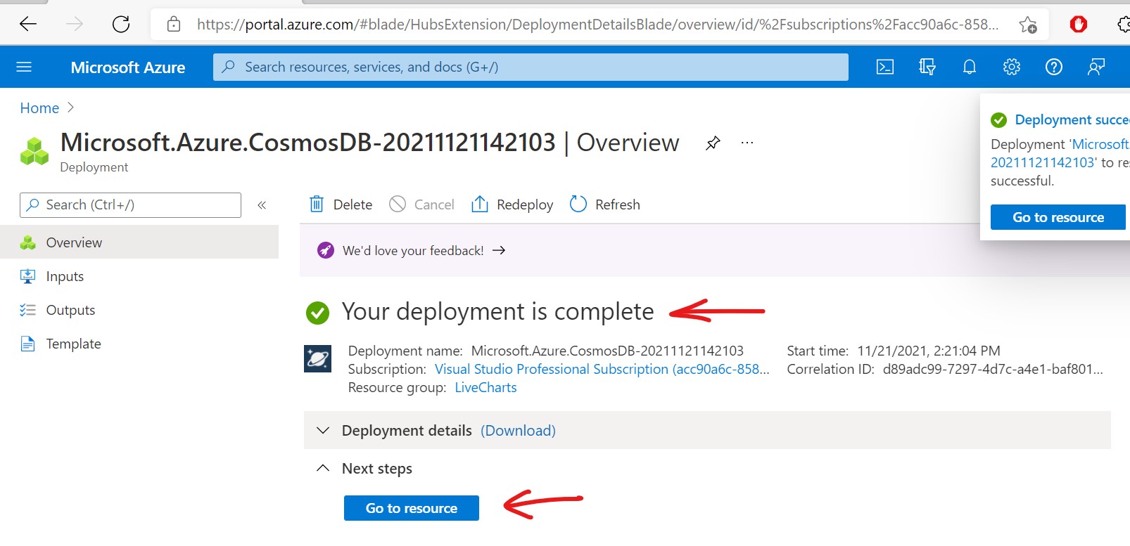 If deployment is successful you will see a screen like this. Congratulations! Your new cosmos db is ready to be used, click on Go to resource button to go to your cosmos db
