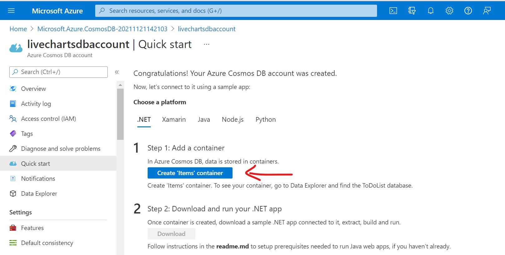 Start by choosing a platform (we will choose .NET for the purpose of this demo) and click on Create 'Items' Container button