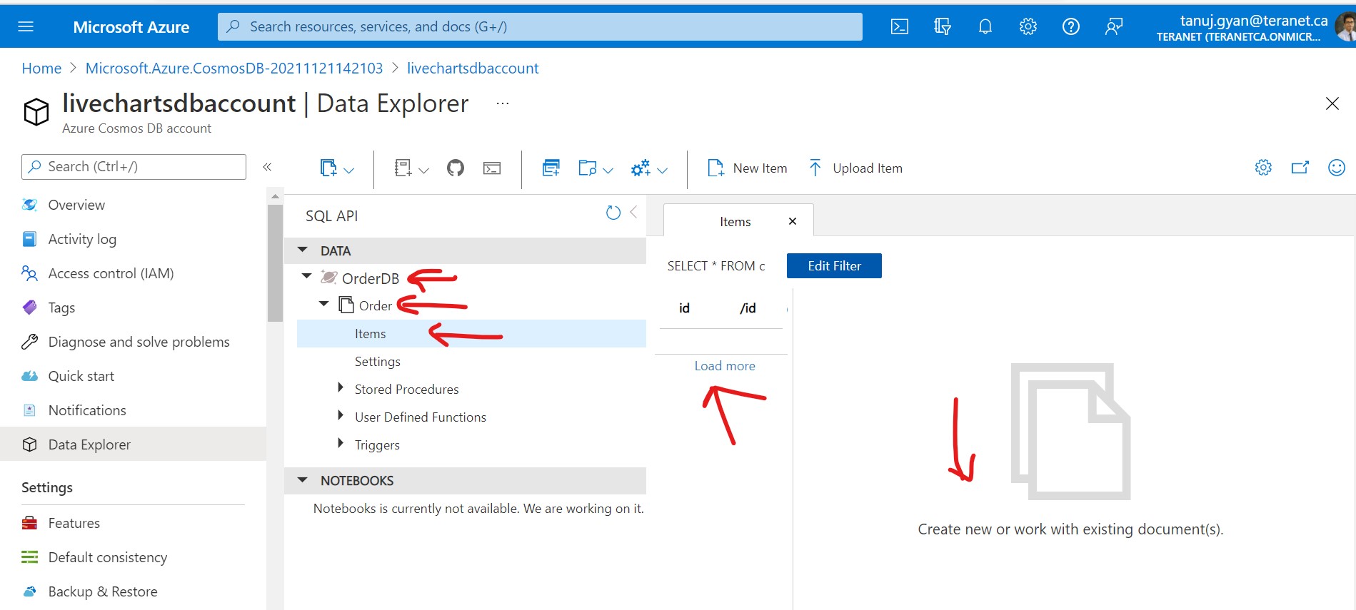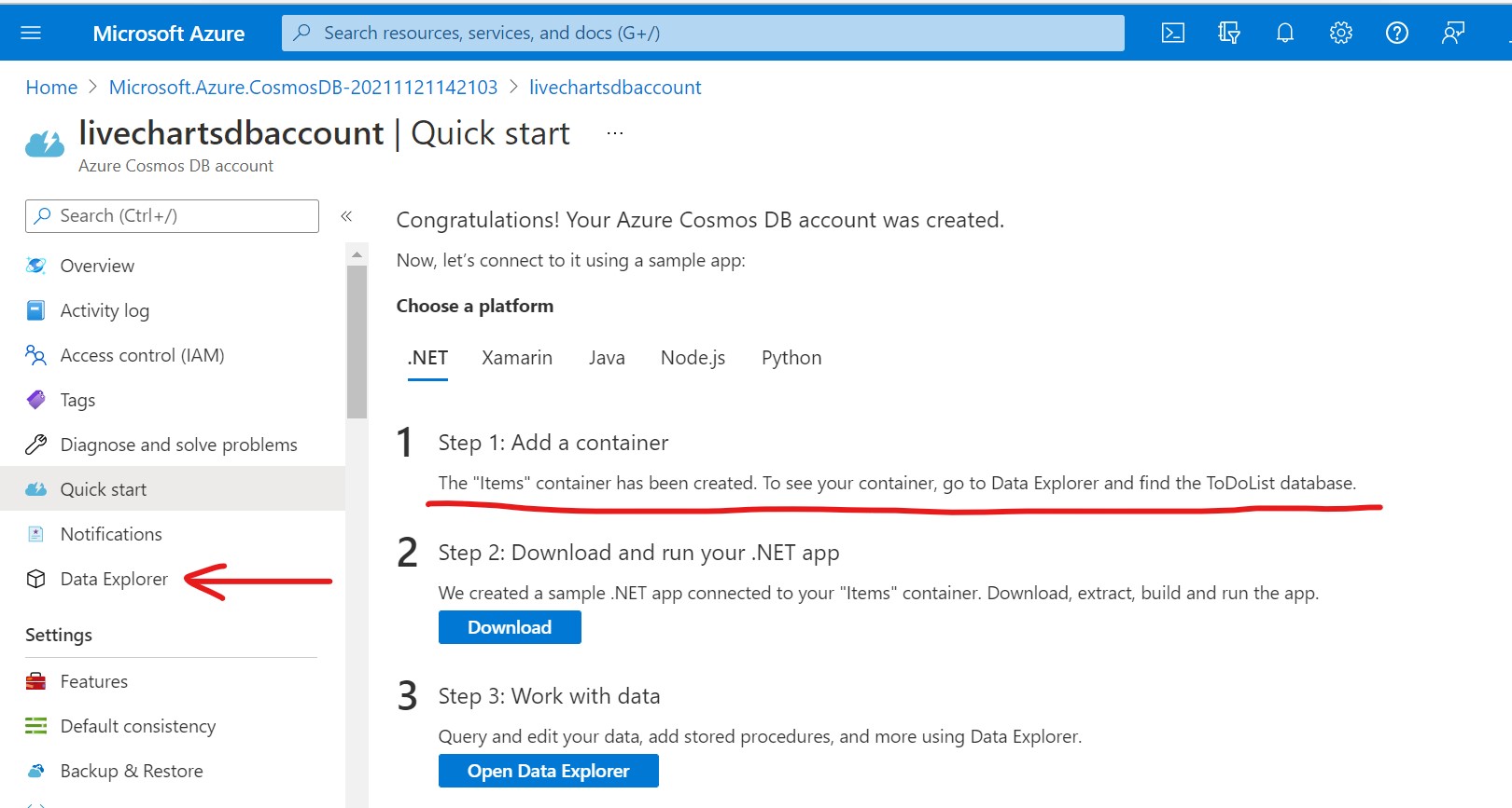 Once the Container is created you will see a screen like this and click on Data Explorer on the left menu to access your newly created container