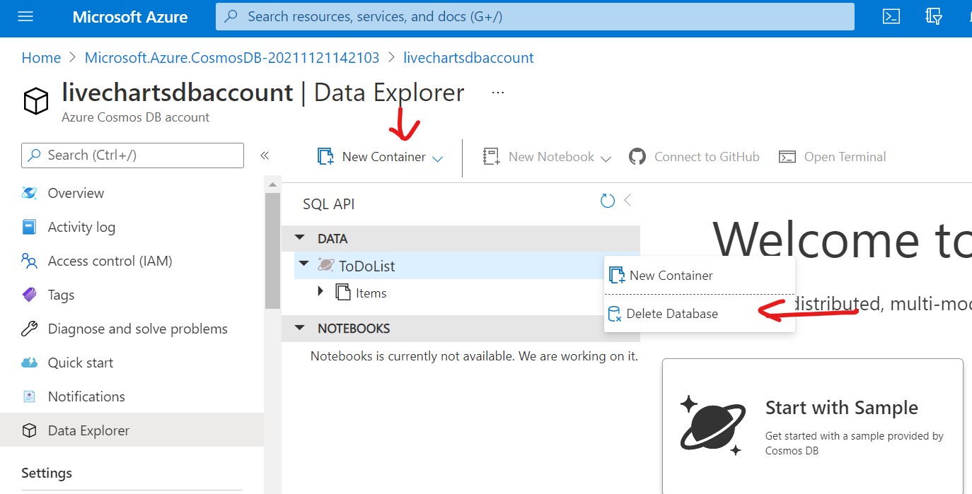 Azure creates a container called ToDoList by default for you. Delete the database by clicking the three dots next to container name and create a new container by clicking New Container option on the top menu