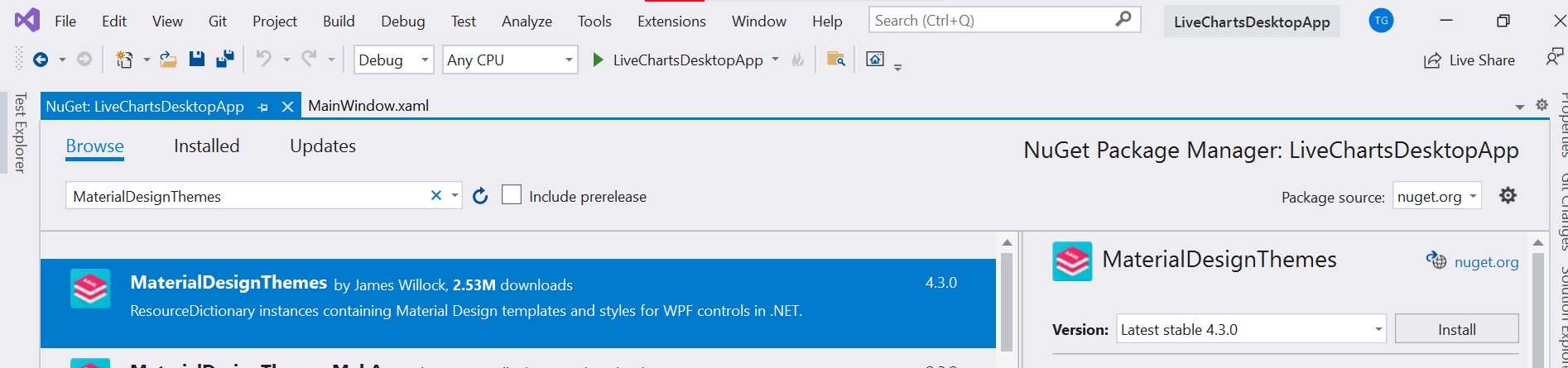 Open WPF project we created in the last article in Visual Studio. Add a MaterialDesignThemes Nuget Package to the project.