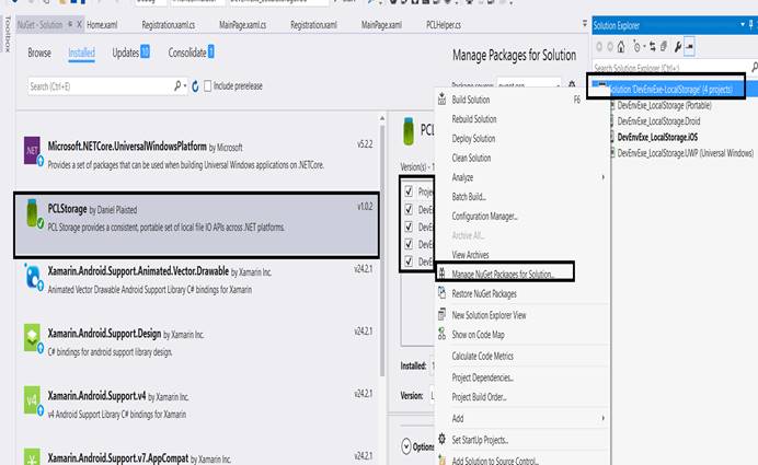 Add the PCLStorage Nuget package to all the projects. Right-click on Project Solution. Click “Manage NuGet package for Solution “. Search and select “PCLStorage”. Select all the Projects. Click Install.