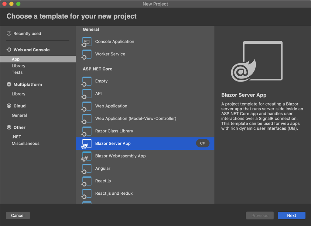 Currently, Visual Studio for Mac 8.8 is available with the Blazor server template. Since we are creating a WebApp, I am using a Visual Studio extension to create it. This extension will provide the template for Razor.