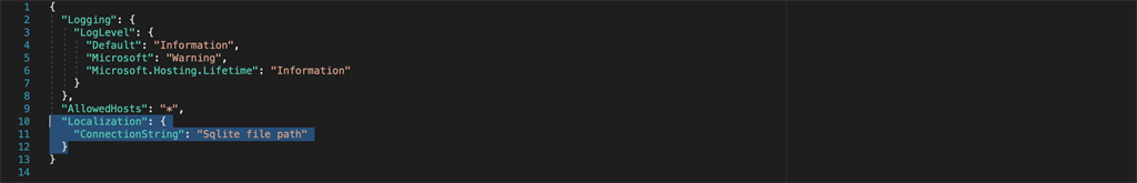 Add a Localization section for the SQLite file path. We will use it for getting translations for our keys.