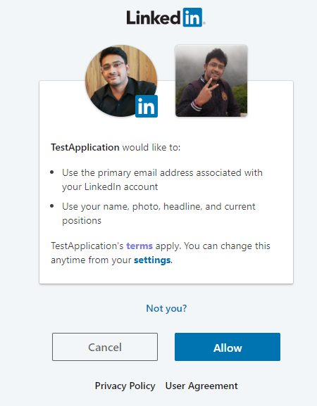 Now, the LinkedIn API will ask for your permission as shown in the figure to grant access to your app. Click on "Allow" button and you will see your basic details on our created page.