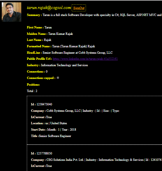 private const string LinkedinUserInfoParameters = "id,first-name,last-name,maiden-name,formatted-name,phonetic-first-name,phonetic-last-name,formatted-phonetic-name,headline,location,picture-url,industry,current-share,num-connections,num-connections-capped,summary,specialties,positions,picture-urls,site-standard-profile-request,api-standard-profile-request,public-profile-url,email-address,languages,skills";
