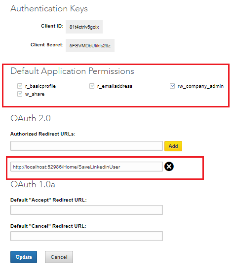 Here, our redirect URL is http://localhost:52986/Home/SaveLinkedinUser.