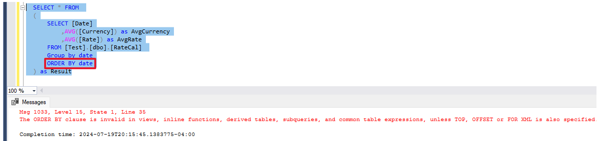 - The ORDER BY clause is invalid in views, inline functions, derived tables, subqueries, and common table expressions, unless TOP, OFFSET or FOR XML is also specified.