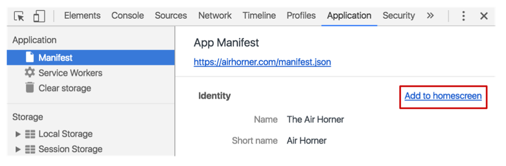 The developer experience would not be complete without the ability to test the add to home screen experience. Chrome has added tooling which allows you to see how your web manifest file is interpreted and manually trigger the prompt.