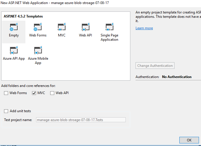 - Choose an empty template with the MVC option only and click OK.