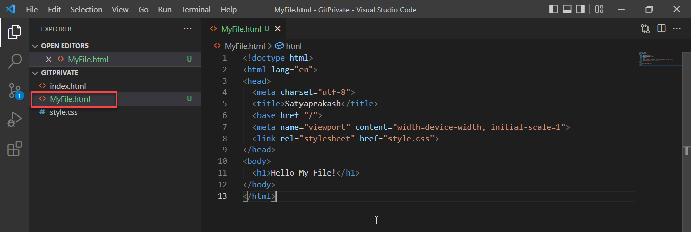 Here I need to create a new file named MyFile.html and push that new file to GitHub repo. Here the symbol "U" on right side of MyFile.html means untracked.