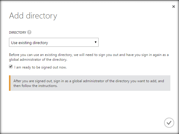 Change the option value to use existing directory. Also make sure you select the check box “I am ready to be signed out now”. Click on the tick mark to proceed with the sign out process. Sign out of Azure subscription and you will have to log in with the credentials of Office 365 Directory global administrator.