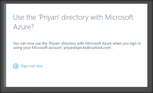 This time, you will be asked, if Office 365 Directory (in my case Priyan) can be used with Azure. If we click continue, Azure administrator will be made the global administrator for both Azure AD as well as Office 365 Directory. In this way, we can manage both directories in one place.