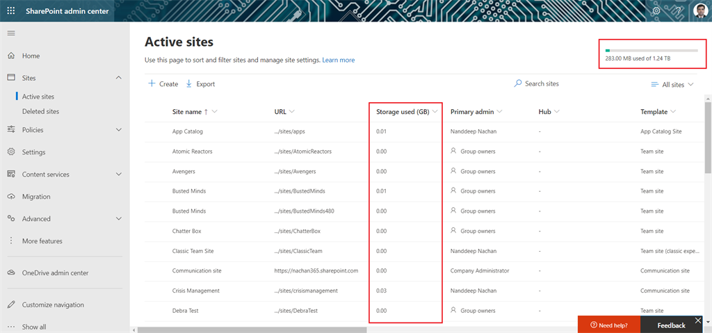 The Active sites page in the SharePoint Online admin center though, shows the storage used for each site. Also, we can see the total storage used and available for use.