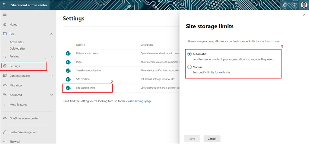 With the manual option, the administrator can configure the maximum storage per site and can also set the notification for site owners when a certain percentage of the site storage limit is consumed.