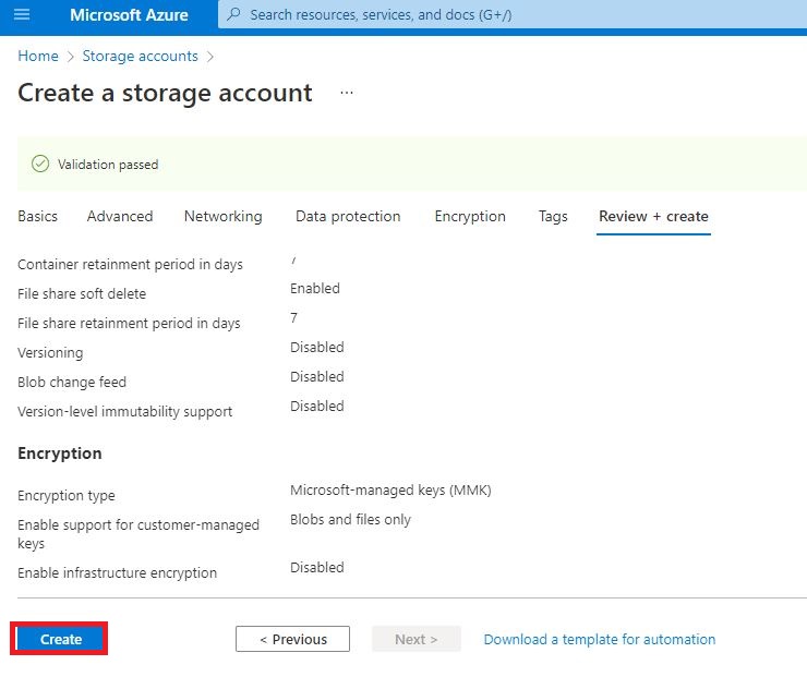 In the Review + create a tab of the Create storage account wizard, perform the following actions,