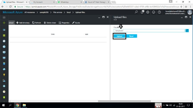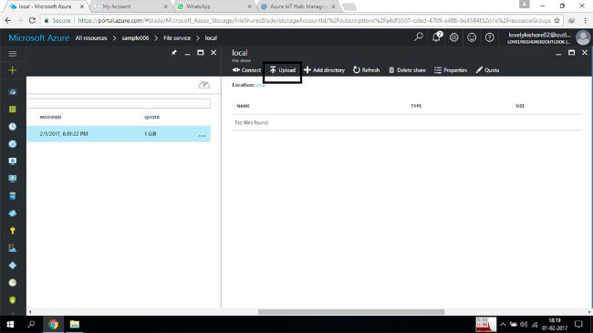 Once the file share gets created, you will see the name of your file share in the file Window. Now click over it to view the pane of that file share in which you can easily upload the files into the file share. To upload the file from the portal, simply click on the Upload button in the top. This will ask you to choose the file to be uploaded. Chose it and click OK button.