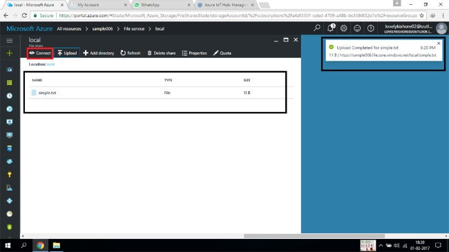 Now, let us see the concept of uploading the files from the local machine, using the network drive. Prior to that, click on the Connect button, which is located in the Window of the file sharing. You can see it highlighted in the previous screenshot. Once you click on it, you will be shown a list of codes for Windows and Linux operating systems. Now, you need to copy the link of your file sharing. This link will help you to map up your network drive to Azure. Copy that link and it is highlighted in the image as a reference for you.