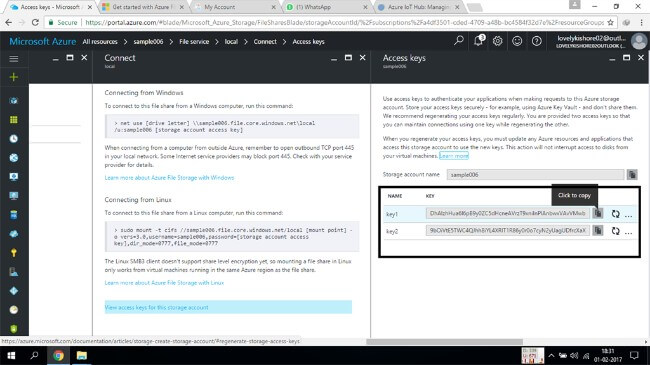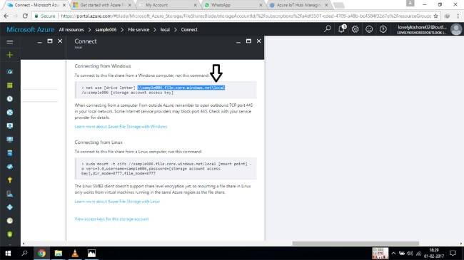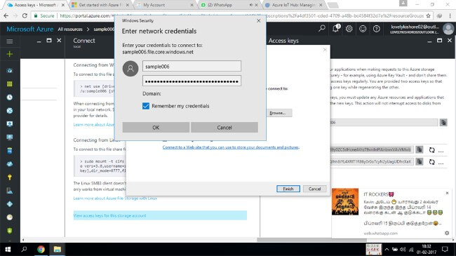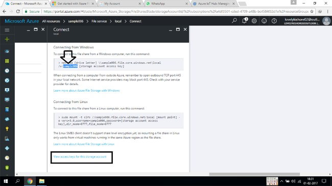 Once you click on the finish button, then you will be asked to enter the user name and password for your network drive. Go back to your portal again and you can find your user name. Your user name is the name of your file sharing. If you don’t remember it, you can see it in the screen shot given below. I have highlighted it for. In the same place, your file sharing name will also be found. Just enter it in the place of your user name and then in the password text box, you need to enter the access key of your file sharing. To get this, go to the portal again and click on the View access key for this storage account. This will show you a new Window with two different access keys for your file sharing. Copy any one of those file shares, paste it up in your password text box and then click OK button. Now, you will be authenticated and a new drive will open up in your local computer and it will be a network drive.