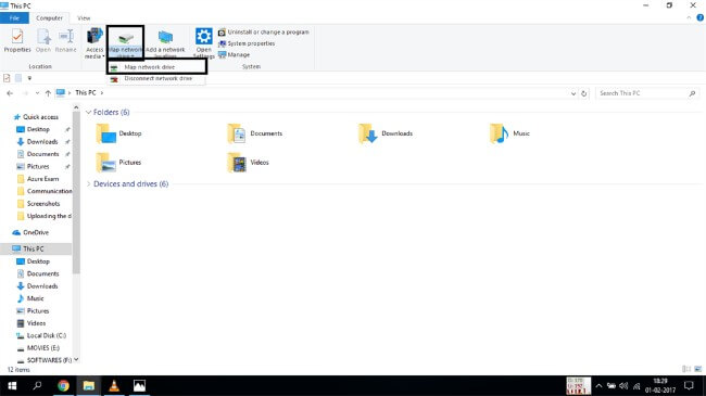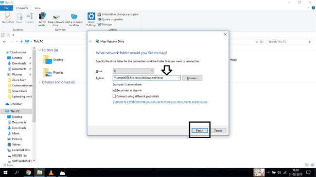 Once you copy the link, open up my computer. Click on this PC option in the left side pane. Now, in the top you can find an option called Map Network Drive. Click on it and then click on Map Network Drive again. This will show you up a configuration Window for the network drive. In the place of the Folder text box, paste the link which you copied previously from Azure portal. Once you paste the link there, click on the Finish button.