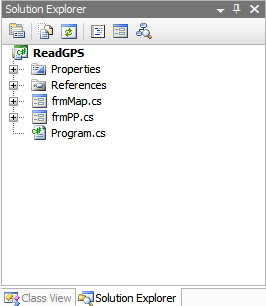 The solution contains a single Windows Forms project called "ReadGPS" which was written in C#; the application contains two forms (frmPP.cs, frmMap.cs) and, aside from the Program.cs file, all of the code necessary to drive the application is contained in those two form classes.
