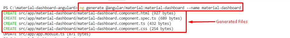 material-dashboard is a starter component, which generates a group of the materialized components in the form of the dashboard by just providing a name, as I've provided in the below command.