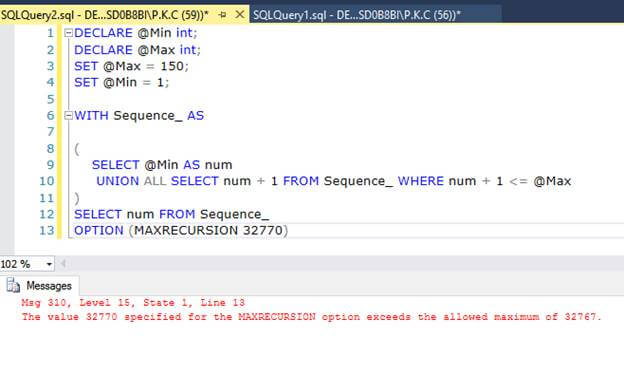 In the example above, we write a recursive query, which returns a number series from 1 to 10 and the number of the recursion is 9. Let’s try to increase the value of @Max from 10 to 110.