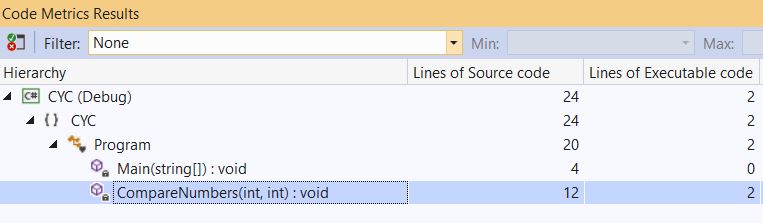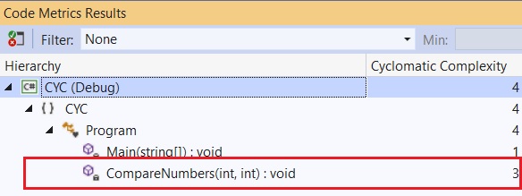 But if you are thinking this is the simplest program and, in your assignments, you get a complex program and it will be impossible to make an equivalent control flow diagram for everything you code, you are absolutely right. Visual Studio calculates this for you and here is the output for the same example,