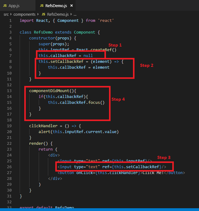 In the above example, we have seen how an input text is used as Ref and how its value can be accessed. This is one of the ways to create and use Refs.