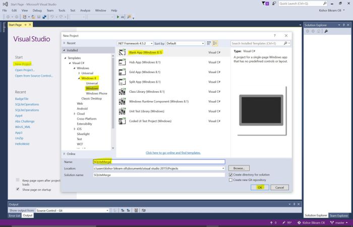 Install ‘sqlite-net’ from the Package manager and also Add reference for ‘SQLite for Windows Runtime’.