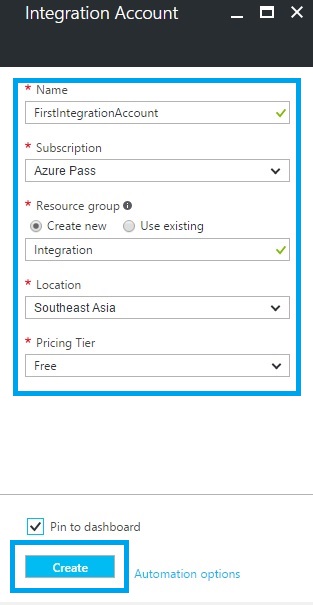 In the Create Integration Account blade, enter the name for our Integration account, select the Subscription which we want to use, either create a new Resource group or select an existing resource group, select a location where our Integration account will be hosted, select a Pricing tier, then select the Create button.