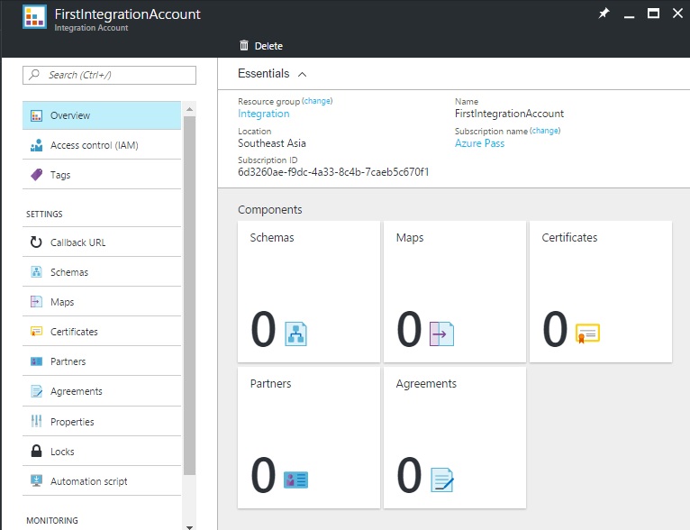 The Integration account is a part of the Logic Apps Enterprise Integration Pack (EIP) and is a secure, manageable and scalable container for the integration artifacts, which we will create. We can store the maps, schemas, partners, agreements and certificates in our Integration account once and reference them across all our Logic Apps, which makes the creation of B2B processes with Logic Apps quick and easy.