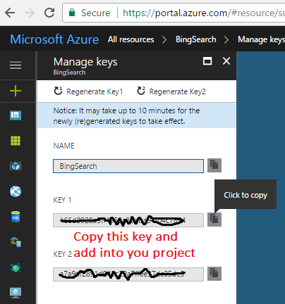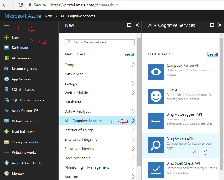 Now, click on "All Resources" in left panel and then find your service which you have recently created. Bing Search Panel will open and follow these steps which I have marked on the below screen.