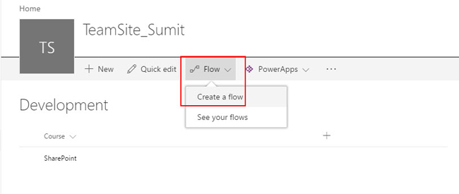 Let’s create a flow to Development List. In the list click on Flow and choose Create a flow.