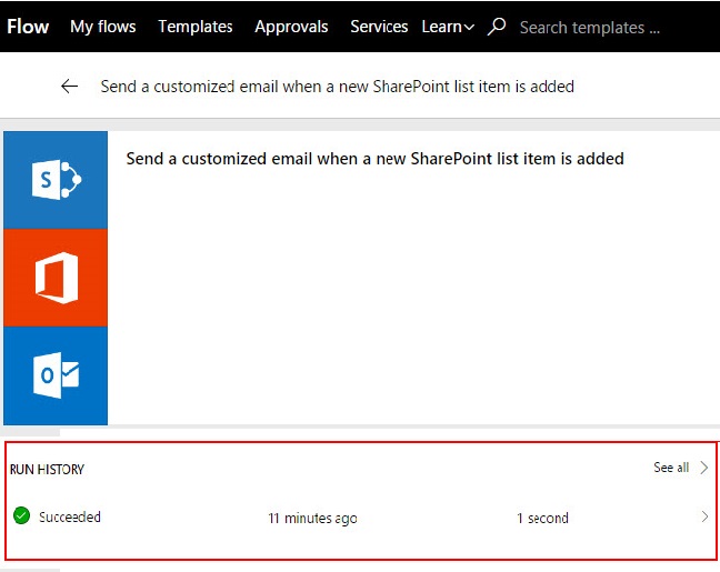 Here is your newly created flow of dashboard. It shows run history status: succeeded with time span.