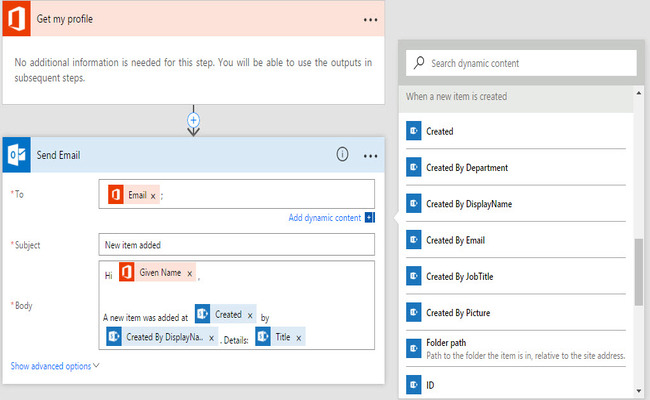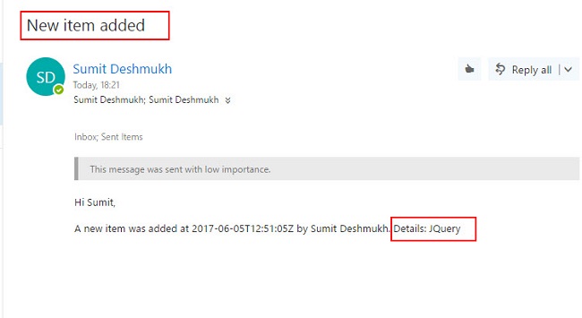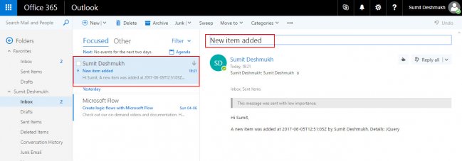 In the above image, the email notification has received the inbox which shows a newly added item, added at (time and date span) and added by (created by) respectively.