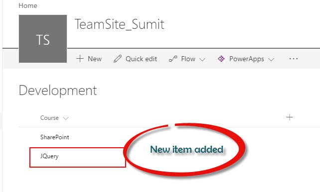 Here I have created a new SharePoint list named Development, where new courses are entered as new items. Title column is renamed into 'Course' column.