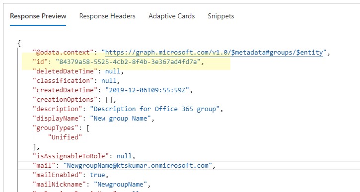 Now we have the id of the newly created Office 365 group. Based on that we will create a new team.