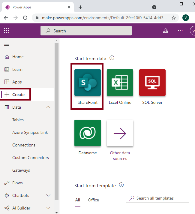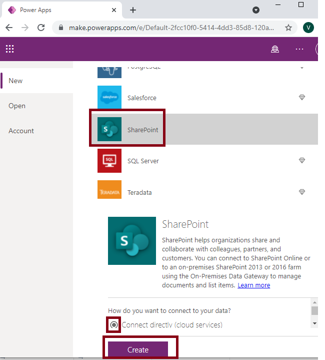 Click on Create (+ ), Start from data and select SharePoint and click New Connection,