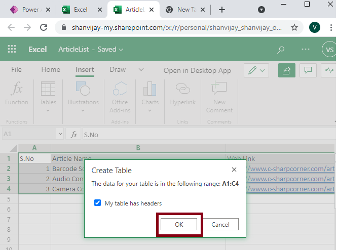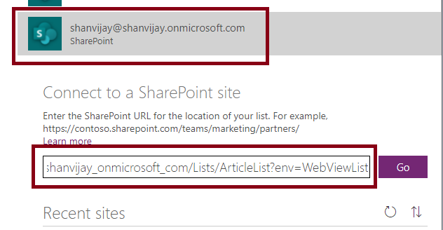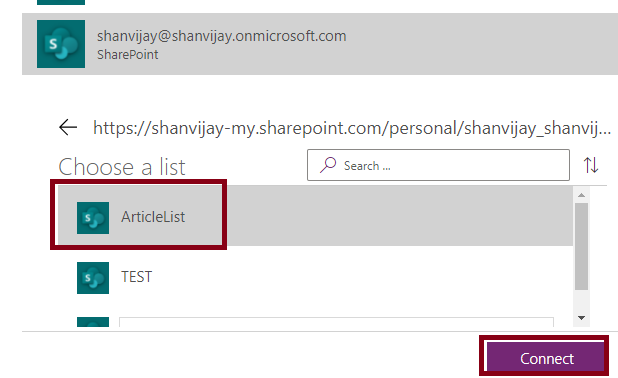 Next, paste the copied link to Connect to the SharePoint Site URL and select ArticleList, and click on Connect.