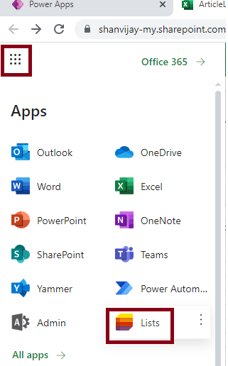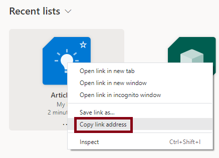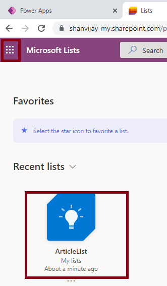 Click App Launcher and Select List, right click the ArticleList, and copy the Link address.