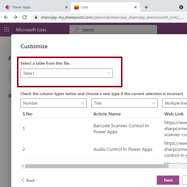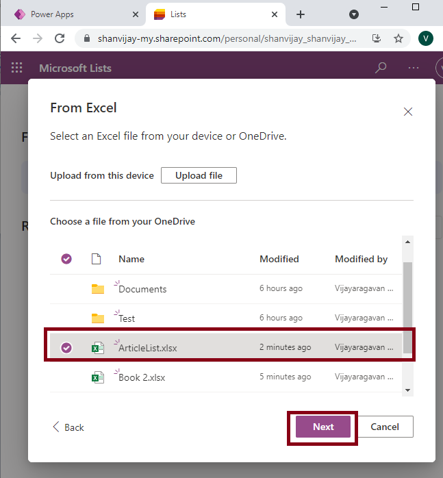 Create List From Excel and select the Excel file ArticleList.xslx and click on Next.
