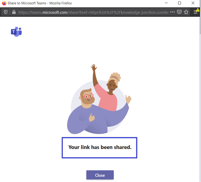 - Please click on "Share" button. If Sharing with Teams happens successfully we will get following dialog "Share to Microsoft Teams" having success message "Your link has been shared." as shown below.
