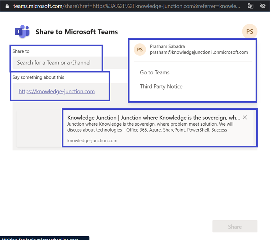 - Once we have selected Team / Channel, and put the note, the "Share" button at right hand side bottom will enabled.