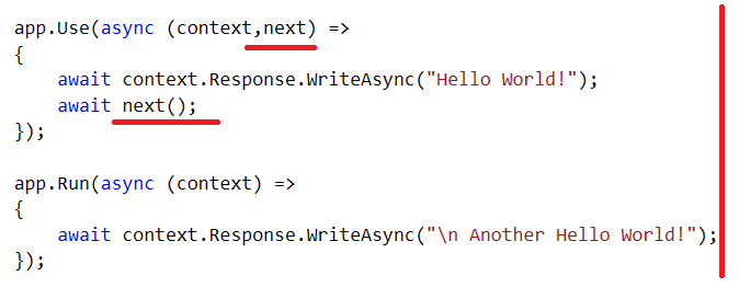- Middleware component needs to have a private property of type RequestDelegate